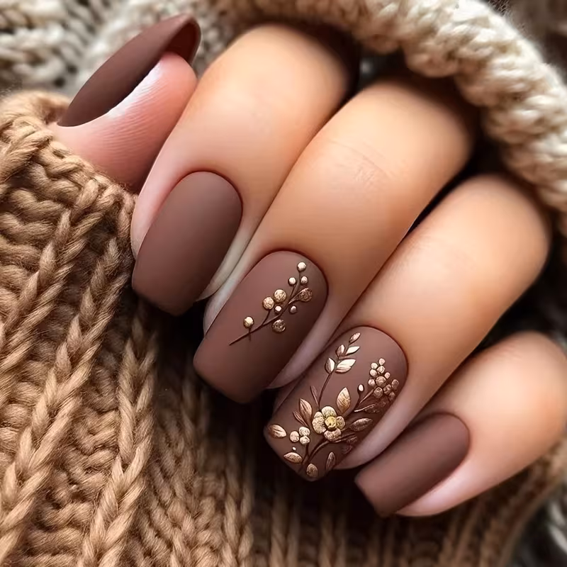 Upgrade your manicure in minutes with these stunning medium length matte brown press-on nails featuring a delicate golden floral design. Designed for effortless beauty, these reusable fake nails deliver salon-quality results at home — no appointment needed.